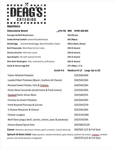 We are offering our Catering Menu for your Holiday needs. Don't feel like cooking order up your favorite Appetizers or Dishes for your get together. We use the highest quality ingredients, and our dishes are made fresh to order. Place your orders online by December 19th and pick up on the 24th.